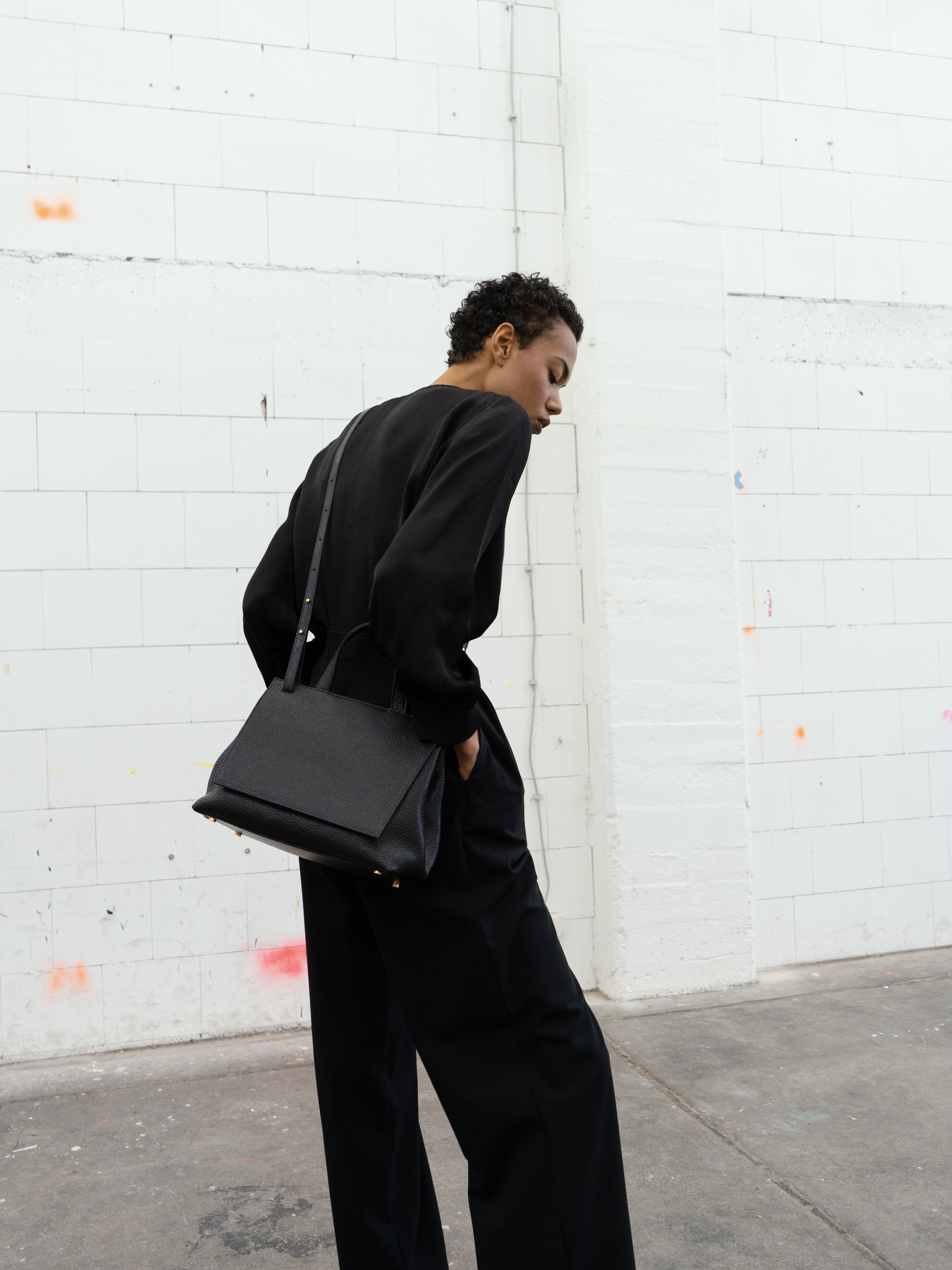Medium shoulder bag with top handle in black bison leather