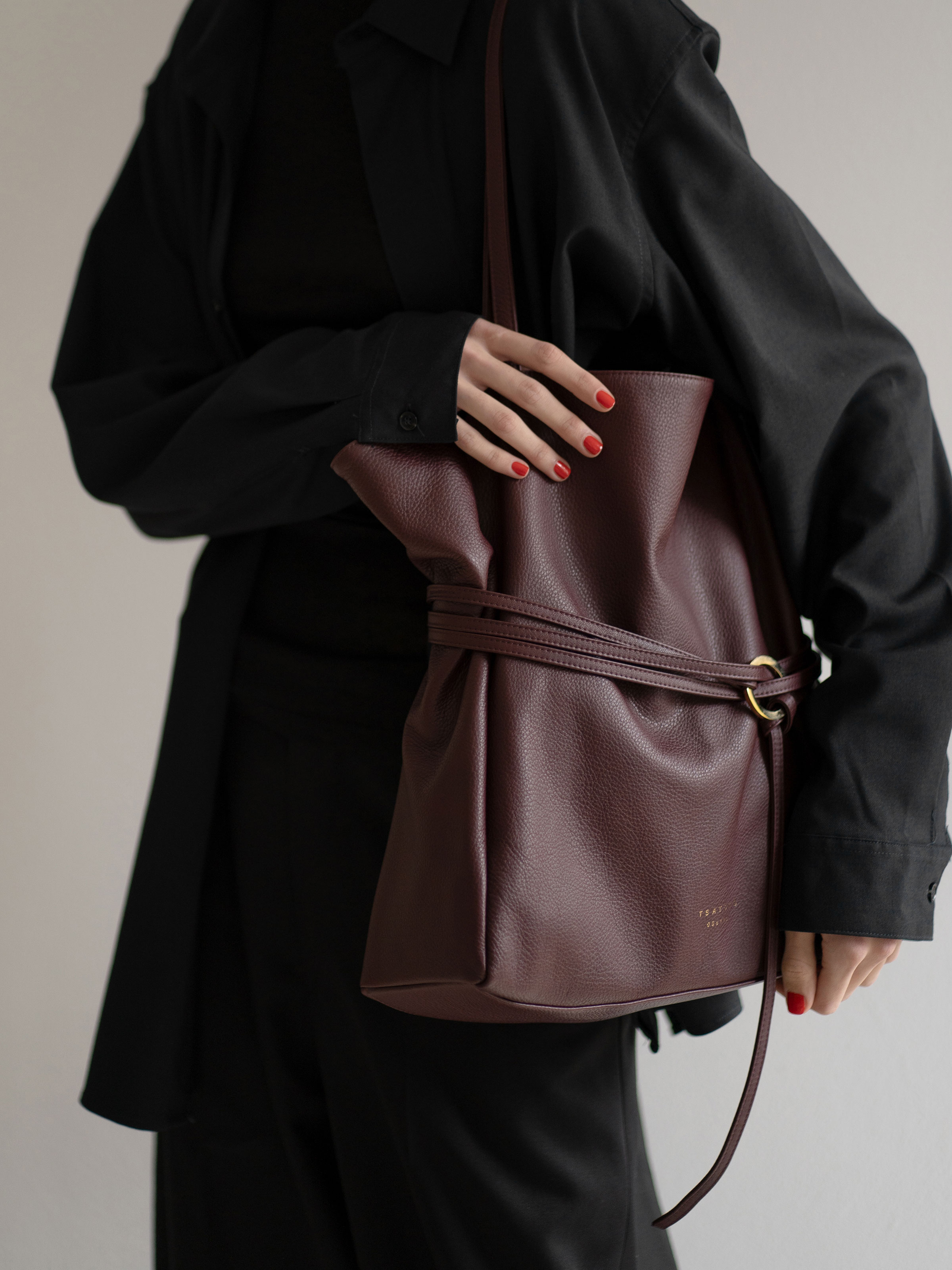 ANIS offers the benefits of a spacious everyday bag paired with sophisticated details. With a capacious interior for all of your essentials, work documents and a small laptop, the lightweight leather bag combines minimalist aesthetics with maximum elegance. A long handcrafted leather strap wraps effortlessly around the supple body of ANIS, offering the option to gather its rectangular shape and fix it with a gold-plated brass ring. The interior of ANIS, lined with buttery soft pacific blue lamb nappa, provides a small detachable leather zip pouch, to store your most needed daily items safe.