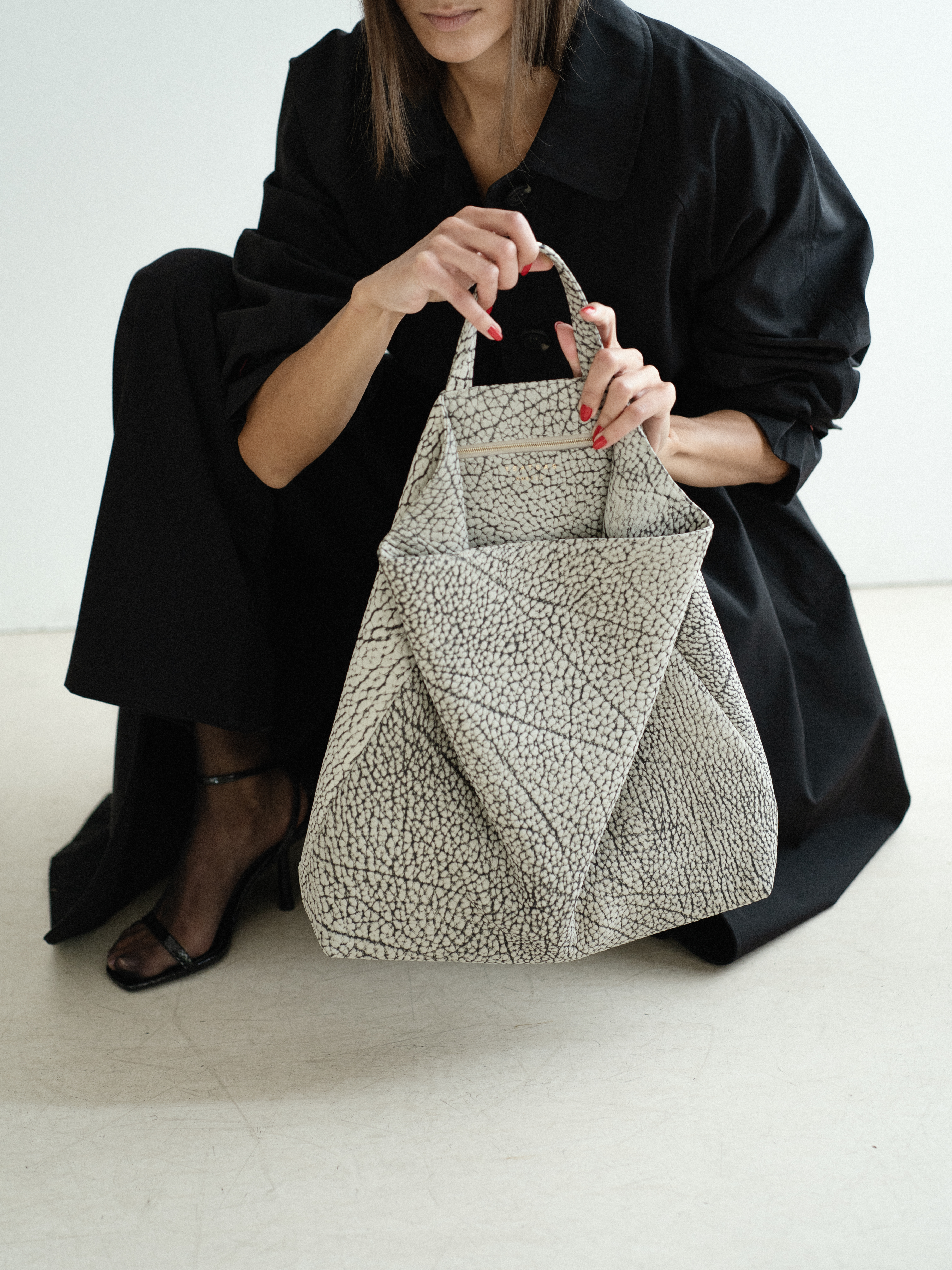 The iconic FLUKE tote bag is an elegant yet progressive day-to-night companion. The distinguished draped leather is giving the bag its signature style, by bringing the upper part of the interior to the outside, revealing the debossed brand’s logo and the individual production number of each bag. A magnetic snap lock closure ensures to keep your valuables safe. The interior is well accessible and reveals two internal pockets set in pacific blue lamb nappa lining, while the outside is complemented with a zipped pocket right below the handle.