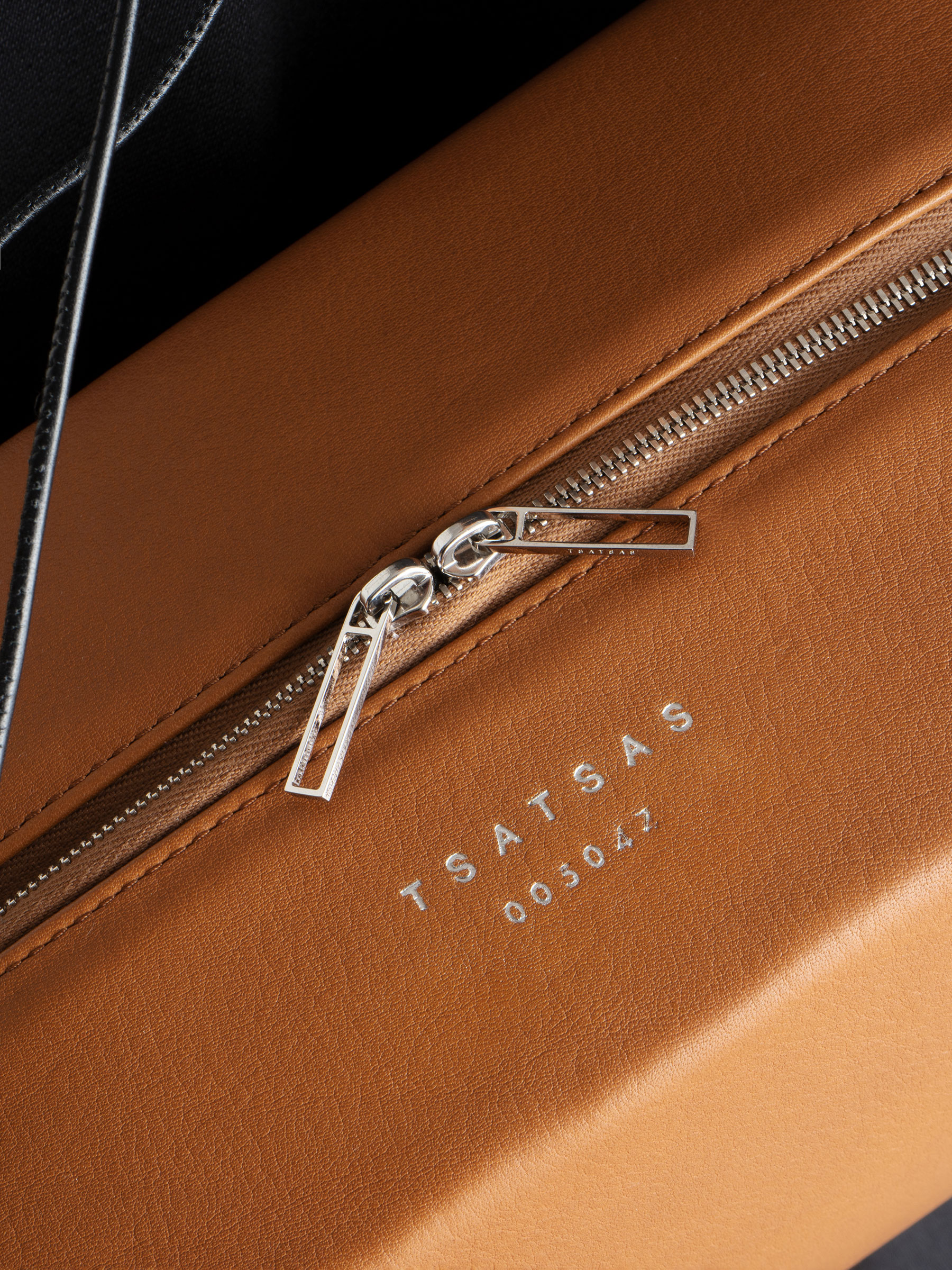 Designed in 2014, LINDEN is characterized by a striking geometric body, contrasted by two fine leather straps. The zip-around closure makes the interior easy accessible, while leather gussets ensure that the shoulder bag can fan out widely while all valuables remain safely inside.