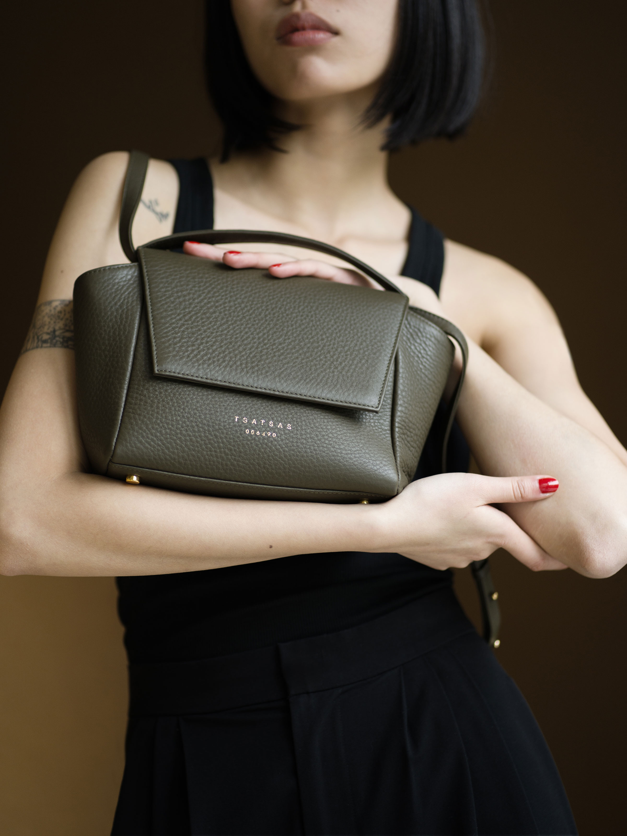 The NEA 1 hand and shoulder bag is a small-scale piece of architecture. It’s geometric composition is characterized by two striking side elements that emerge from the body of the bag, forming the perfect interior for your belongings during day and night. An adjustable and detachable shoulder strap, a front flap opening and base studs made of recycled brass are the comfortable features of the bag, as well as the sophisticated interior of NEA 1 which is offering two internal pockets, of which one fastens with a zip, and a lining of softest pacific blue lamb nappa leather.