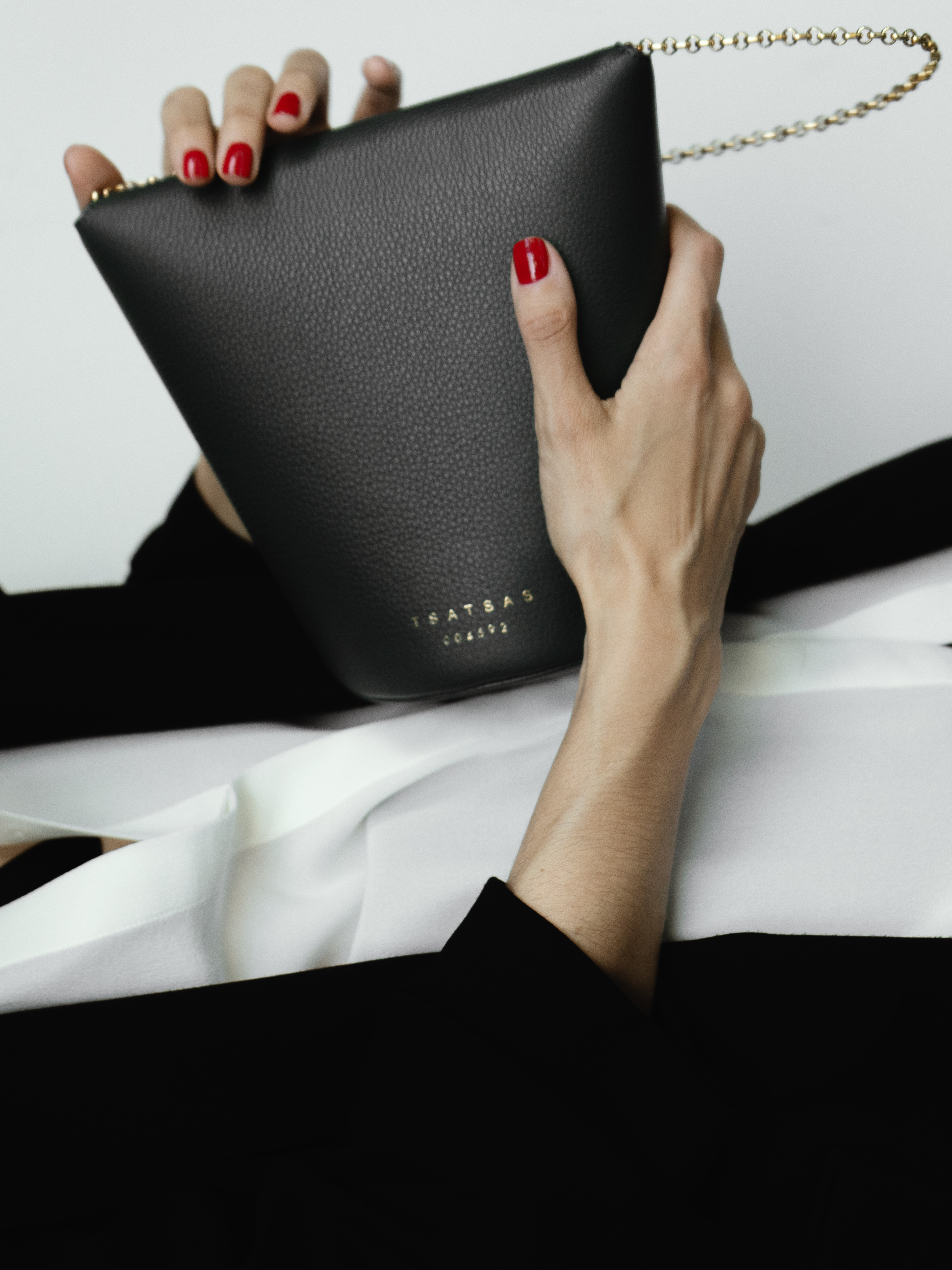 Minimalist and at the same time sculptural: With its unconventional shape the shoulder bag OLIVE is an elegant yet progressive companion for day and night. The purist lines of OLIVE’s body evolve from a circular base to a narrow top that closes with a magnetic back flap, to maintain the visual strictness of the bag. Its geometric volume, lined with the finest blue lamb nappa leather, contrasts with a filigree brass chain made in Italy, providing a feminine touch.