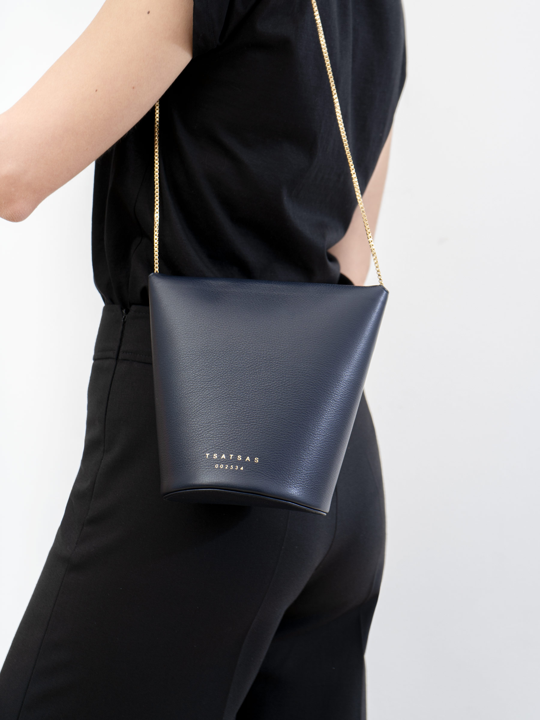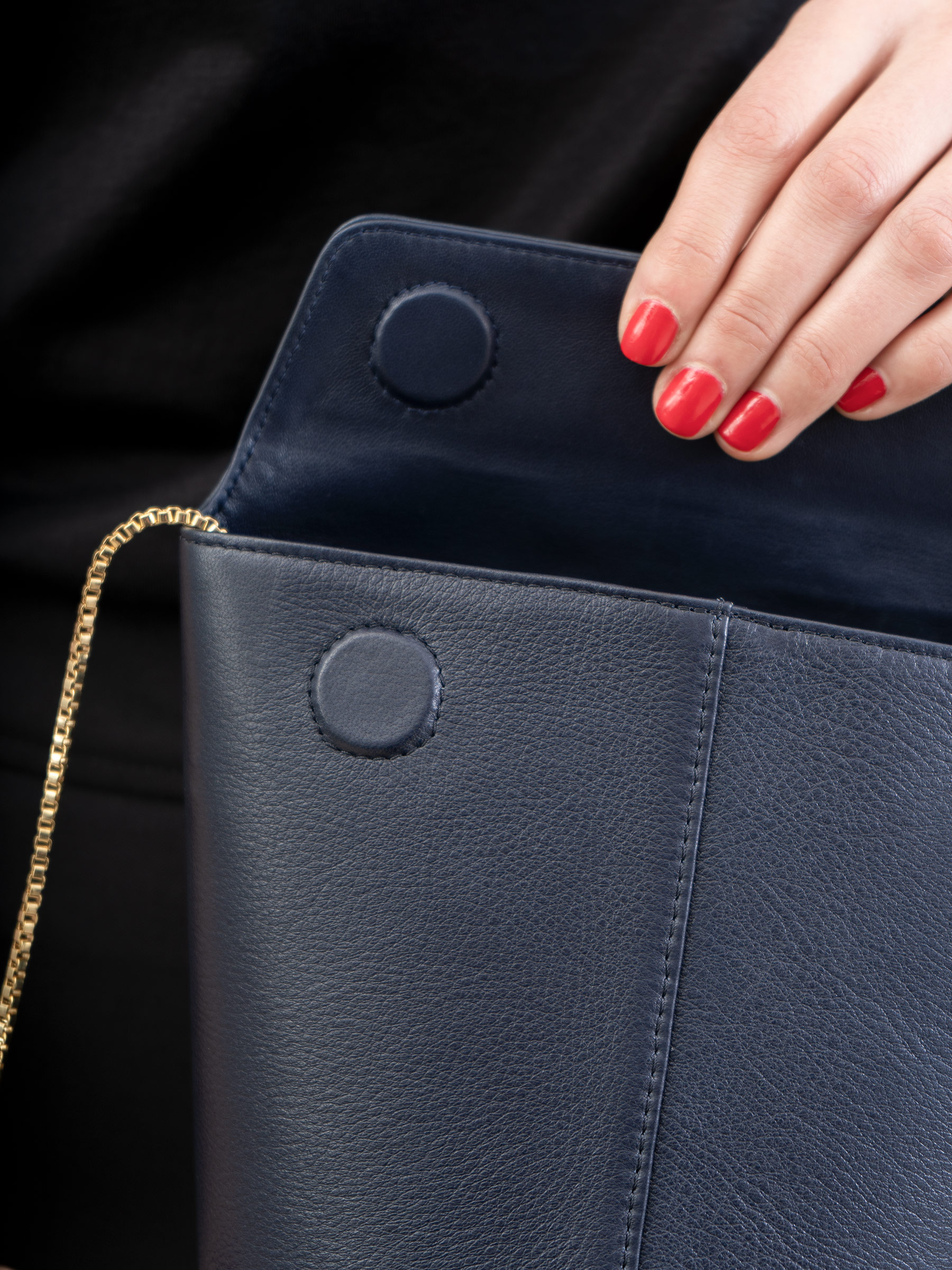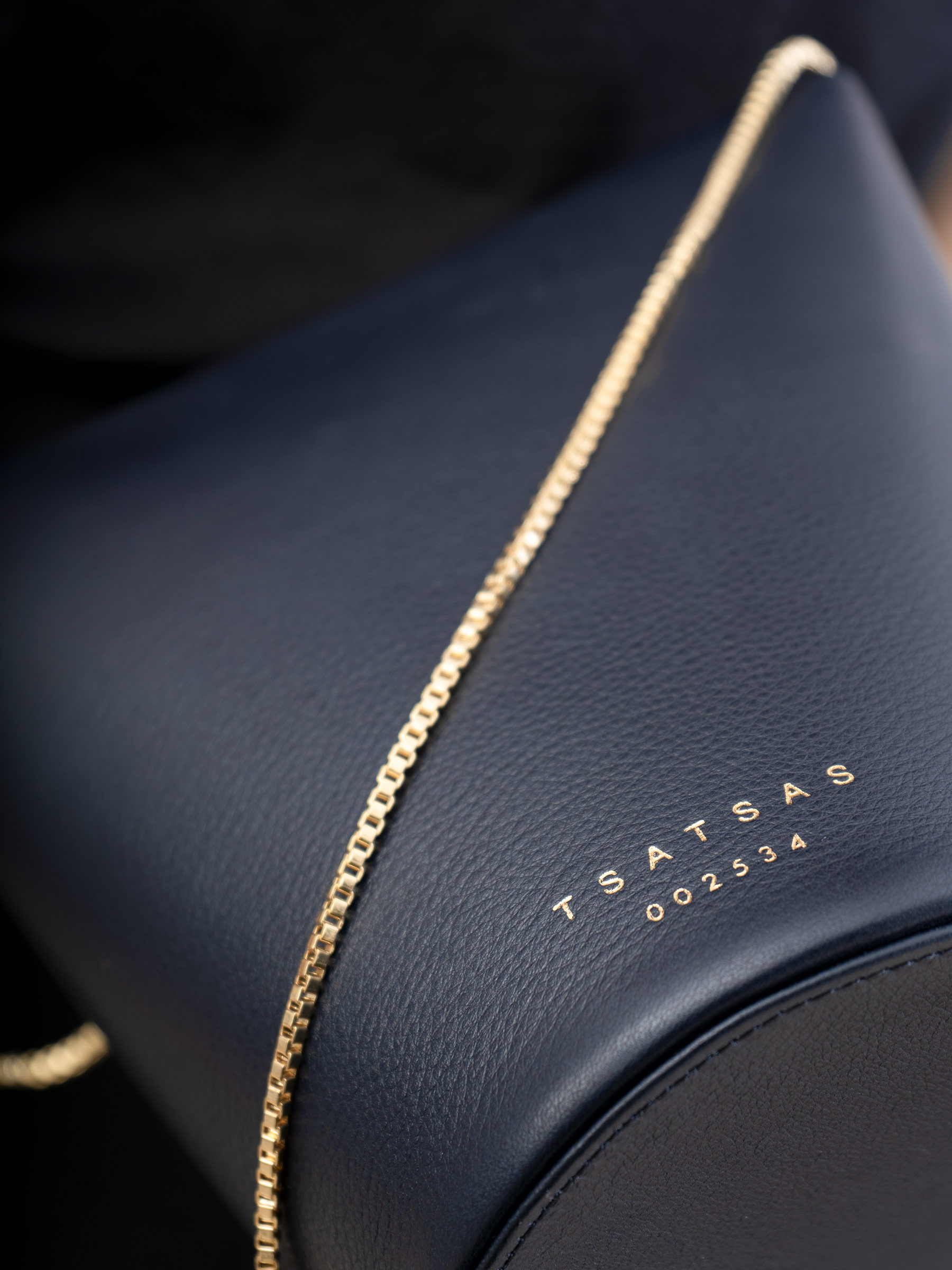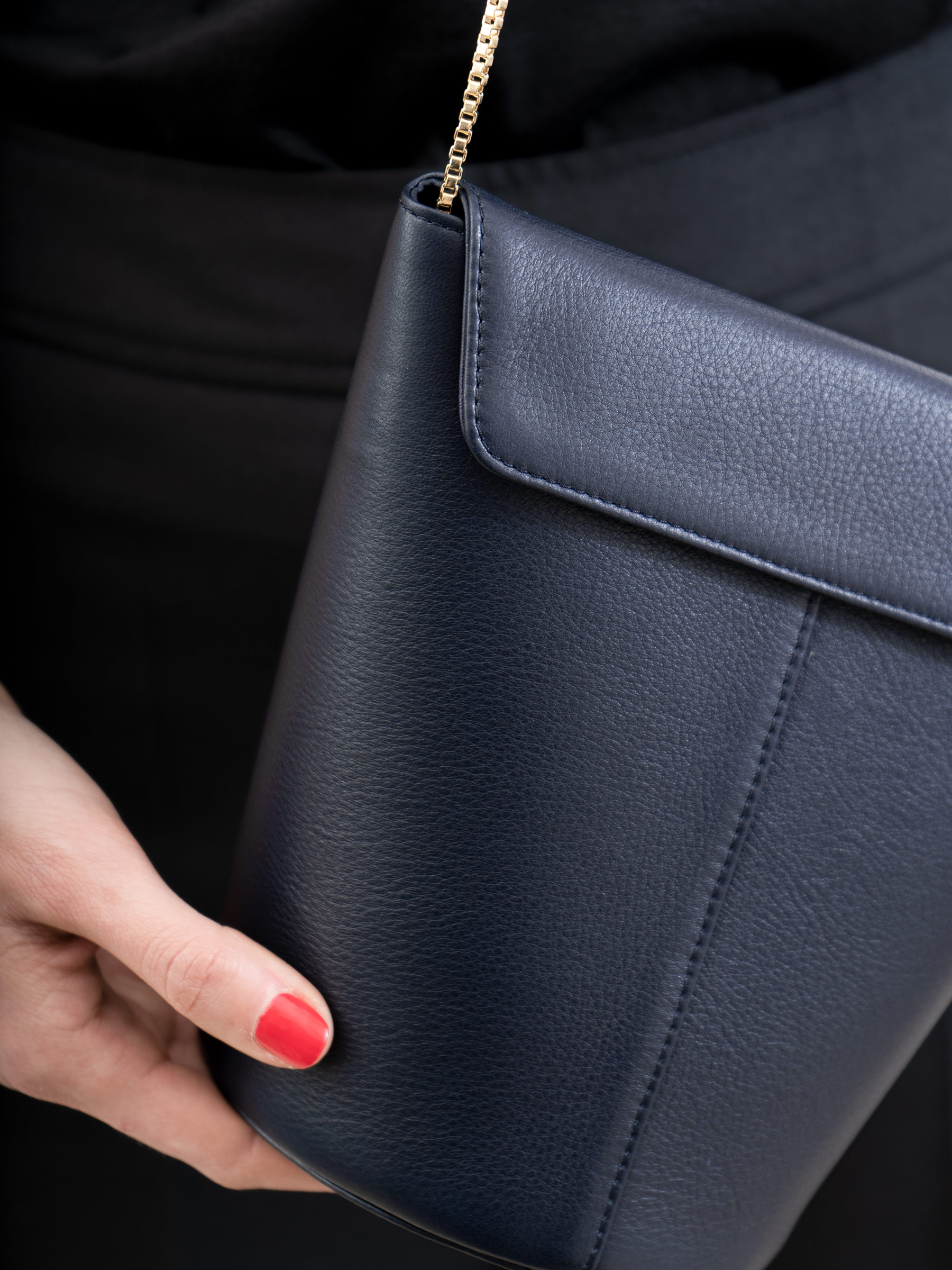 Minimalist and at the same time sculptural: With its unconventional shape the shoulder bag OLIVE is an elegant yet progressive companion for day and night. The purist lines of OLIVE’s body evolve from a circular base to a narrow top that closes with a magnetic back flap, to maintain the visual strictness of the bag. Its geometric volume, lined with the finest blue lamb nappa leather, contrasts with a filigree brass chain made in Italy, providing a feminine touch.