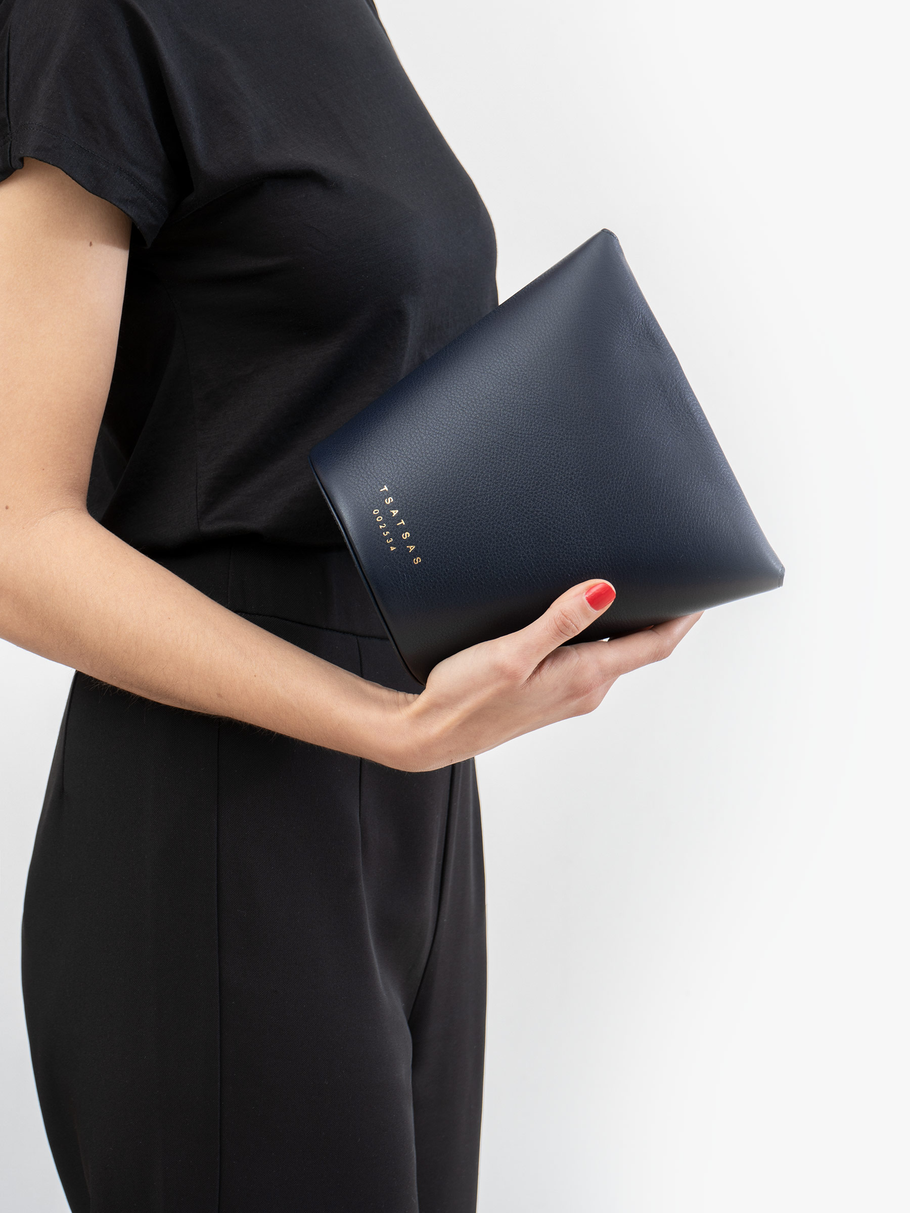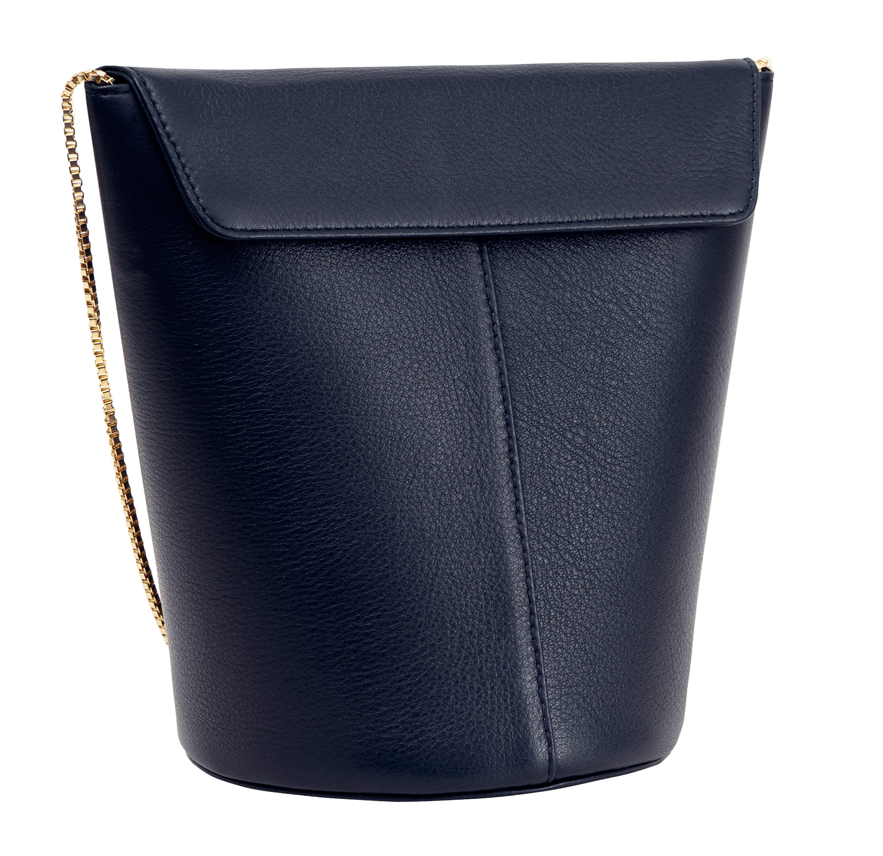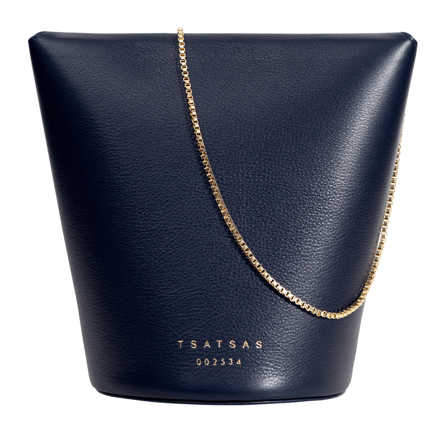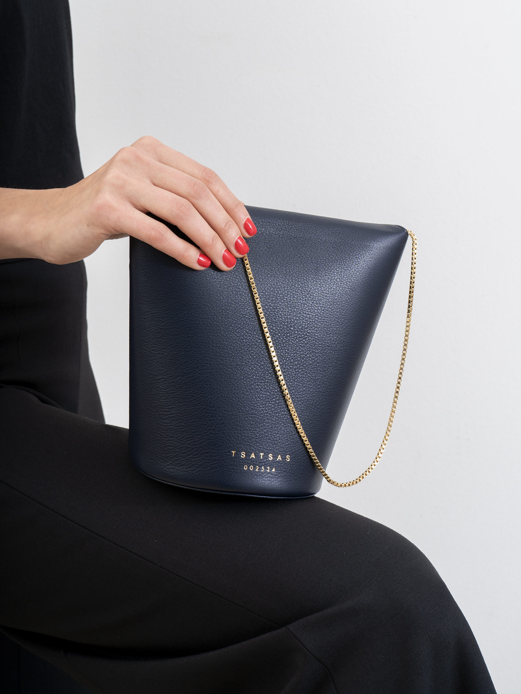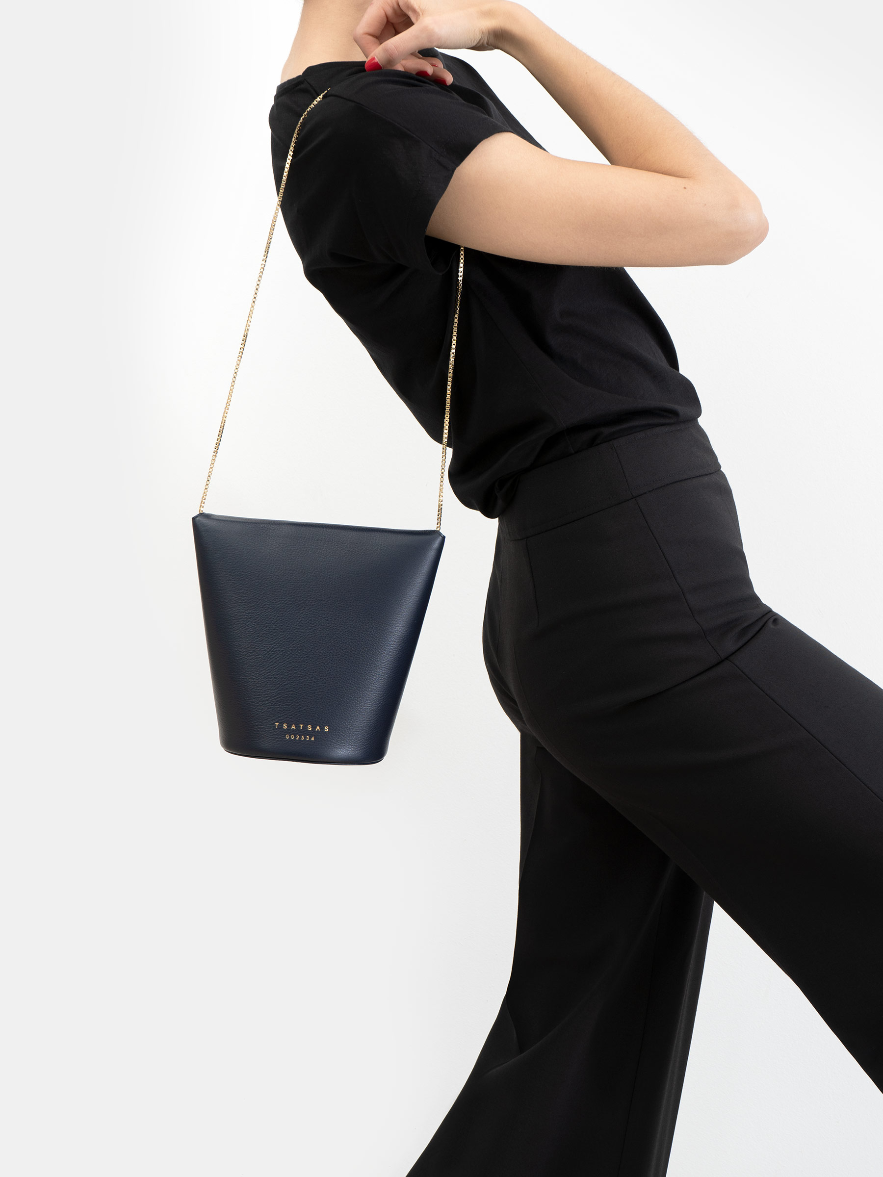 Minimalist and at the same time sculptural: With its unconventional shape the shoulder bag OLIVE is an elegant yet progressive companion for day and night. The purist lines of OLIVE’s body evolve from a circular base to a narrow top that closes with a magnetic back flap, to maintain the visual strictness of the bag. Its geometric volume, lined with the finest blue lamb nappa leather, contrasts with a filigree brass chain made in Italy, providing a feminine touch.