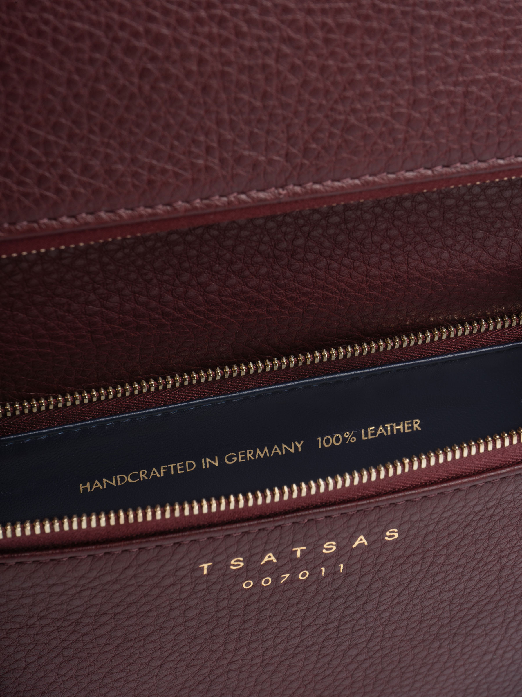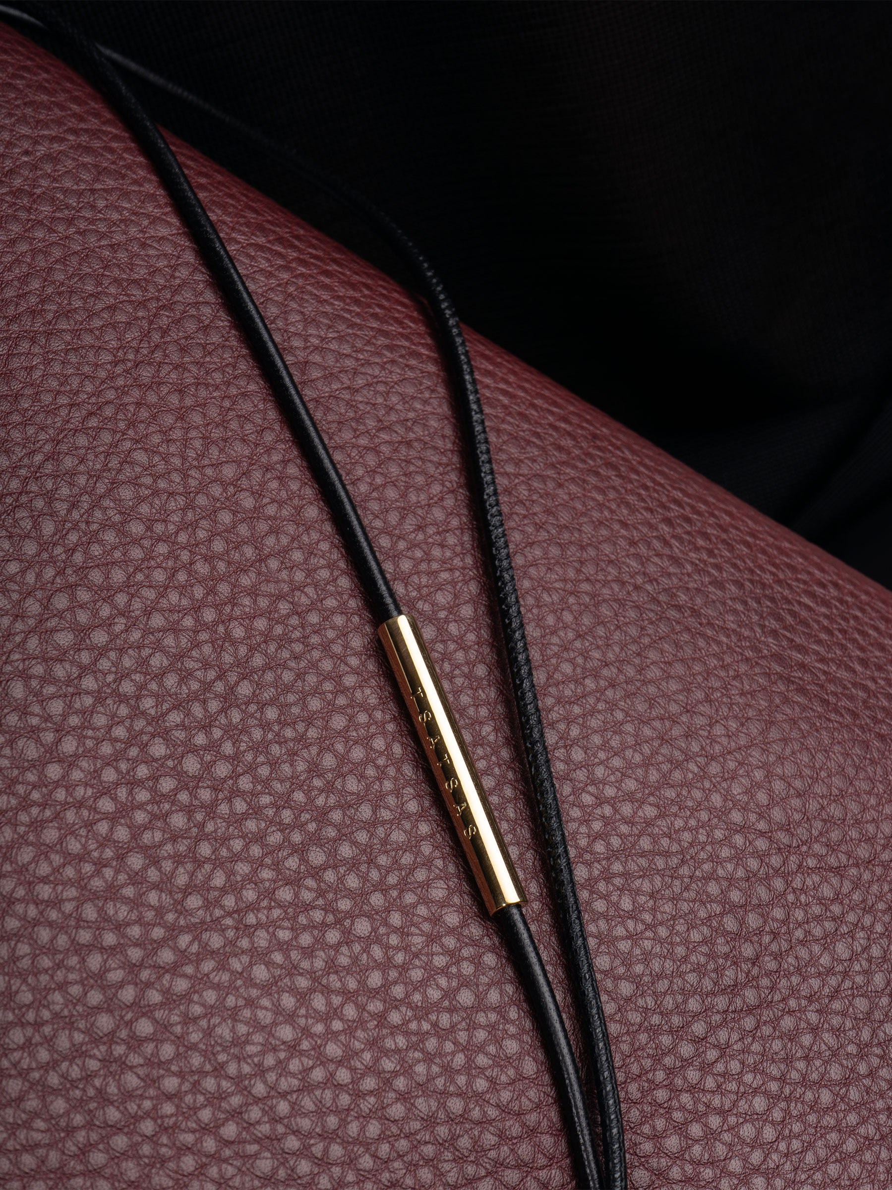 On the inside two zip-fastened compartments, lined in softest pacific blue lamb nappa, store your daily belongings like a wallet, keys and your phone safe and at the same time easy accessible by switching the bag from the inside to the outside. The black leather strap is accented with a small delicate tube crafted of recycled brass in Italy.