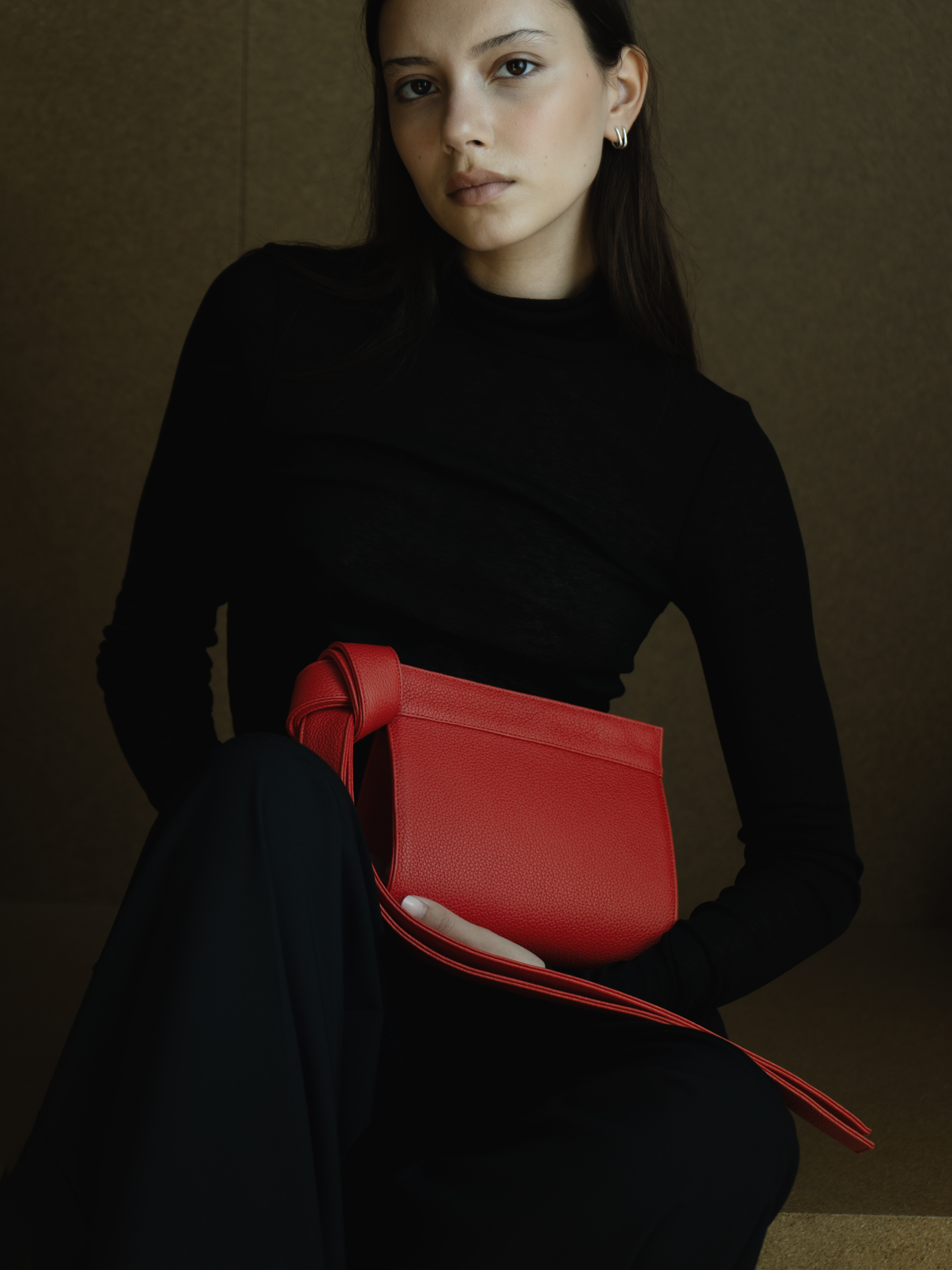 The strictly geometric body of the TAPE XS clutch forms a fascinating contrast to the artfully knotted and softly falling long straps. You can choose between carrying the elegant bag in your hand or holding it loosely by the straps. As with all TSATSAS products, TAPE XS is lined with the finest pacific blue lamb nappa leather and detailed with an internal pocket.