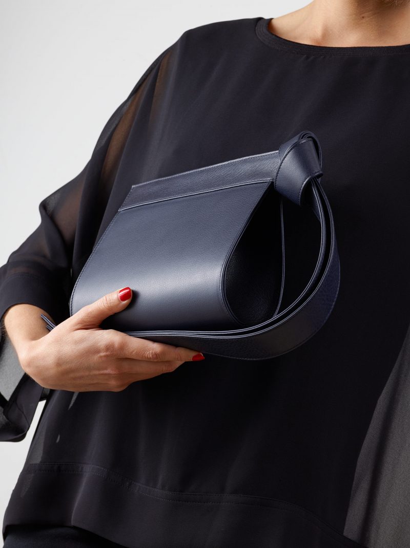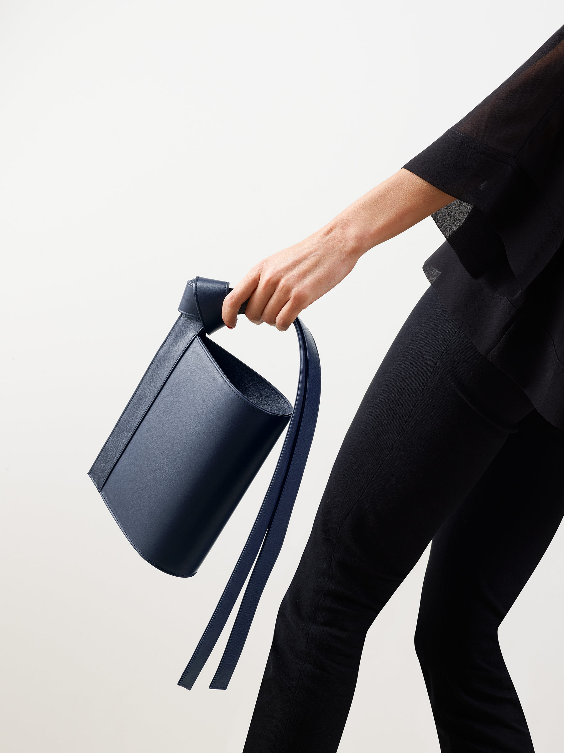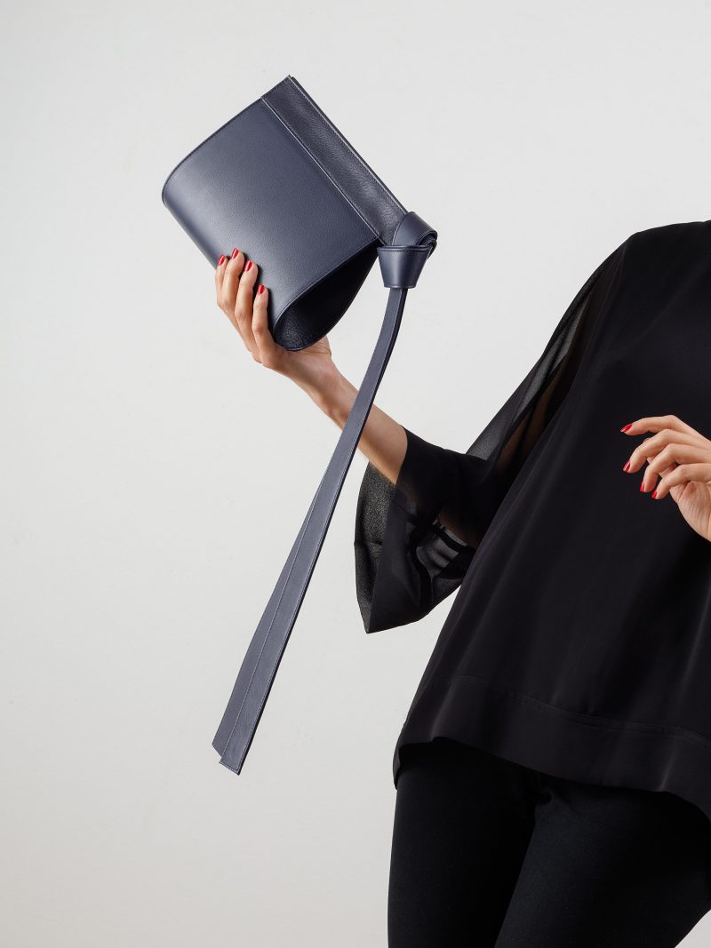 The strictly geometric body of the TAPE XS clutch forms a fascinating contrast to the artfully knotted and softly falling long straps. You can choose between carrying the elegant bag in your hand or holding it loosely by the straps. As with all TSATSAS products, TAPE XS is lined with the finest pacific blue lamb nappa leather and detailed with an internal pocket.
