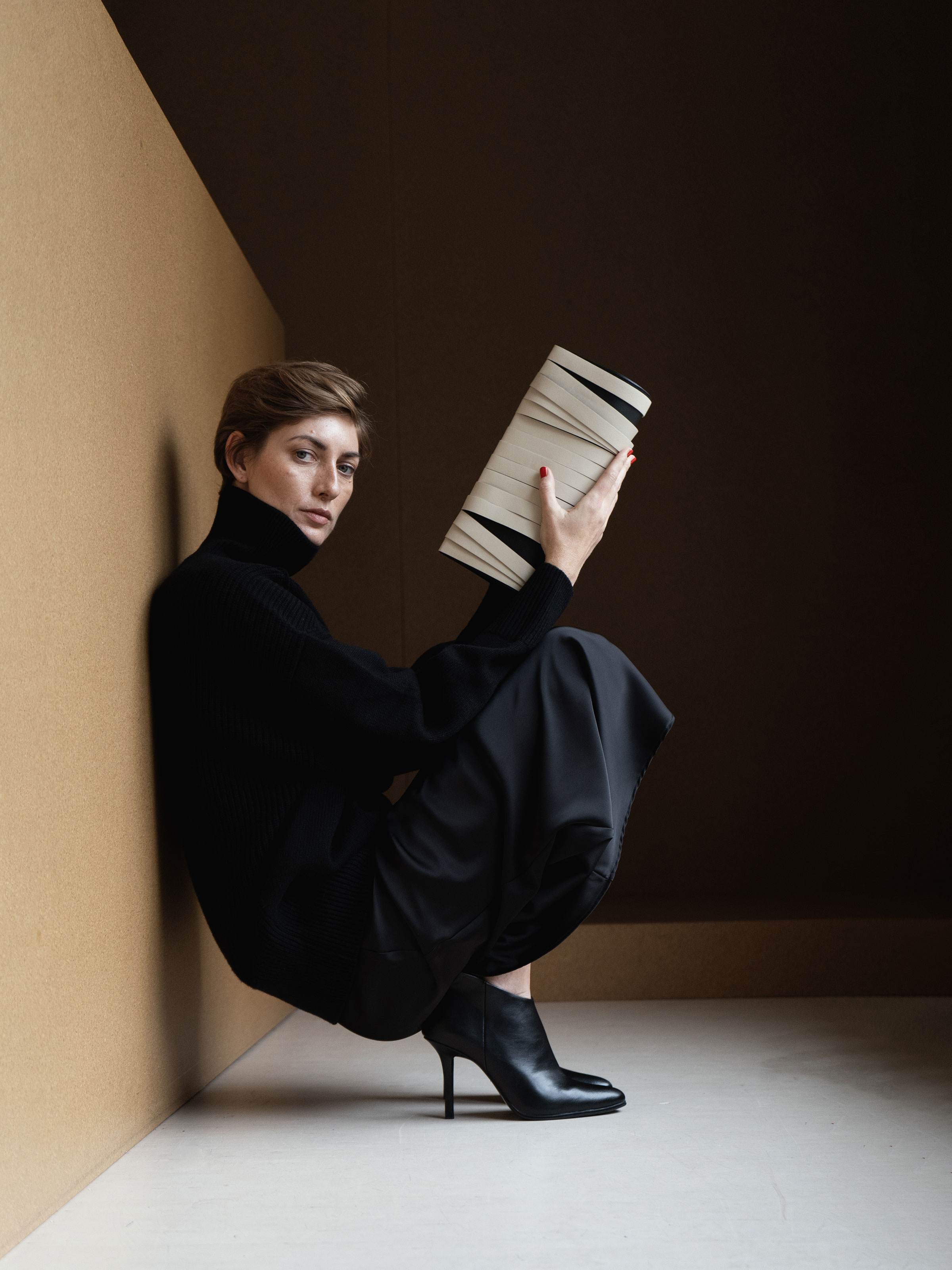 Its strictly geometric body is enwrapped by meticulously crafted calfskin straps, with hand-polished edges and varying in length and structure. Each strap is carefully selected and cut by hand from leftover pieces of leather which often deemed too small for a conventional use in bags or accessories. The result is a thoughtfully orchestrated system of straps, either pulled taut or left to cascade loosely around the bag’s body.